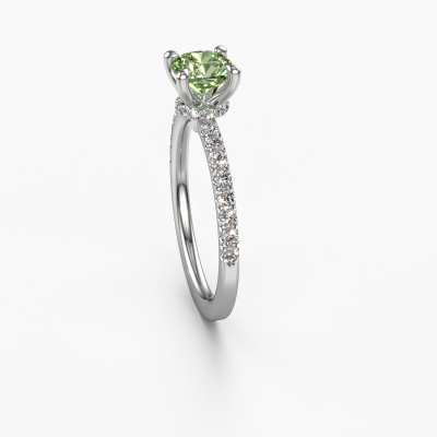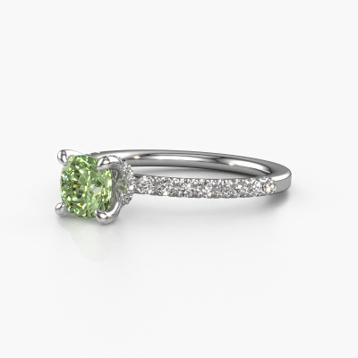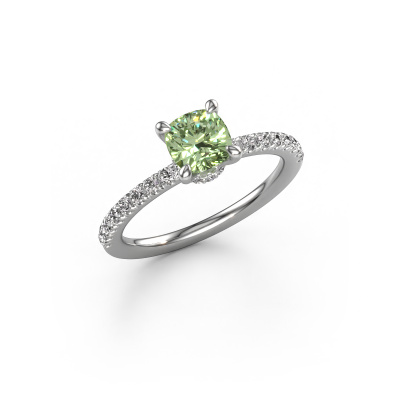 The ring shown above is called the Crystal CUS 4. We call this type of ring a pavé solitaire ring because it has one center gemstone and a band that is also pave set with gemstones. The platinum engagement ring is set with a cushion 5.5 mm green lab grown diamond center stone and the band is pave set with diamond gemstones. Each jewel is created to add sparkle to your finger, each jewel is lovingly made by hand by our goldsmiths.This chic platinum pavé solitaire engagement ring has an exquisite cushion green lab grown diamond center stone. To further accentuate the center stone, the band is fully set with more diamonds. Its open prong setting allows light to strike the green lab grown diamond from various angles and this adds sparkle to your green lab grown diamond ring. The photo shown above depicts the goldsmith's carefully handcrafted details of the ring. The high positioning of the center stone is truly eye-catching. The perfect engagement ring for the crown jewel of your life! By using our modern techniques, we can design and customize the finest quality jewels with the utmost care for you. Our engagement rings are always priced 30 percent lower than other jewelers. We make engagement rings to order so we don't have to maintain a large stock. If you have a certain budget, we are more than happy to advice you accordingly.Do you have a specific ring in mind? One you came across somewhere. Please feel free to tell us your wishes and we will turn your design into a unique engagement ring. You can follow the development of your ring design because we use 3D drawings. This gives you a realistic preview of your design. We will gladly send you a non-binding offer, based on a fair price/ quality ratio. It will amaze you.To make it easier for you, we offer a 30 day return policy. Check our terms and conditions.