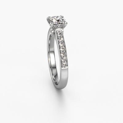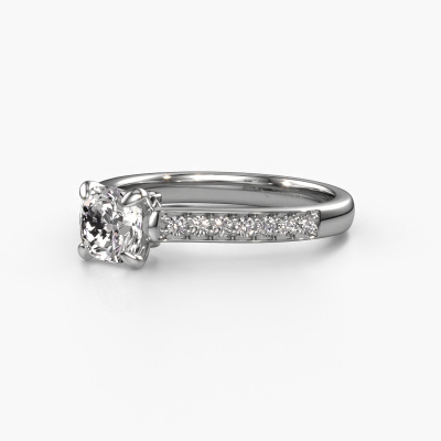 The ring shown above is called the Valorie cus 2. We call this type of ring a pavé solitaire ring because it has one center gemstone and a band that is also pave set with gemstones. The platinum engagement ring is set with a cushion 1.00 crt lab-grown diamond center stone and the band is pave set with diamond gemstones. Each jewel is made just for you by our master goldsmiths in our own studio.This traditional platinum pavé solitaire engagement ring has an exquisite cushion lab-grown diamond center stone. To further accentuate the center stone, the band is fully set with more diamonds. Its open prong setting allows light to strike the lab-grown diamond from various angles and this adds sparkle to your lab-grown diamond ring. The photo shown above depicts the goldsmith's carefully handcrafted details of the ring. The high positioning of the center stone is truly eye-catching. The perfect engagement ring for the crown jewel of your life! By using a combination of the latest modern techniques, combined with ancient crafting, we can make all our engagement rings in our own studio. Each jewel is made to order. This is advantageous because we can offer you a price you won't find anywhere else.Our designers and goldsmiths work together each day, creating new jewels. Perhaps you have found a nice traditional engagement ring somewhere, which can be used to customize your unique ring. Please feel free to contact us. We will make you an offer, based on a fair price/ quality ratio, which will amaze you.To make it easier for you, we offer a 30 day return policy. Check our terms and conditions.