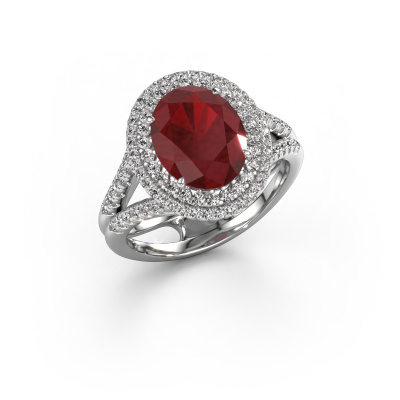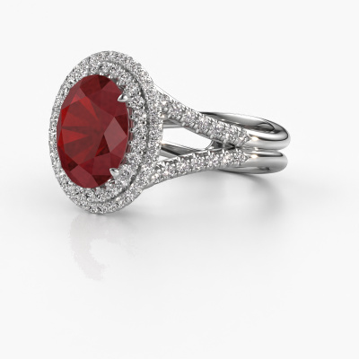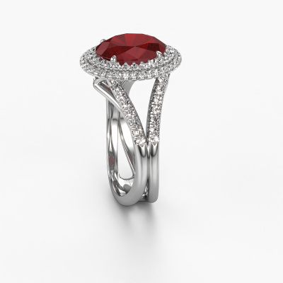 The ring shown above is called the Elvie. We call this type of ring a halo ring because it has one center gemstone and a band that is also pave set with gemstones. The platinum engagement ring is set with a oval 10x8 mm ruby center stone and the band is pave set with lab grown diamonds. What makes this vintage platinum pavé solitaire ring special are the smaller sized stones embracing the center stone. This gorgeous engagement ring is called a pavé solitaire ring because the smaller gemstones give the center stone a pavé solitaire of surrounding light. In order for the smaller stones to enhance the center stone, they have to be placed so there is no interference of light. And that's when our expert goldsmiths come in. Each individual stone is carefully set in the ring by hand. During manufacturing, light fall is constantly monitored to make sure the special pavé solitaire is still visible. In the end you get a unique engagement ring, with a ruby of your choosing at its centre. You can imagine the effect of a ring of such significance when you give it to her on her special day to shine. By using our modern techniques, we can design and customize the finest quality jewels with the utmost care for you. Our engagement rings are always priced 30 percent lower than other jewelers. We make engagement rings to order so we don't have to maintain a large stock. If you have a certain budget, we are more than happy to advice you accordingly.Do you have a specific ring in mind? One you came across somewhere. Please feel free to tell us your wishes and we will turn your design into a unique engagement ring. You can follow the development of your ring design because we use 3D drawings. This gives you a realistic preview of your design. We will gladly send you a non-binding offer, based on a fair price/ quality ratio. It will amaze you.To make it easier for you, we offer a 30 day return policy. Check our terms and conditions.