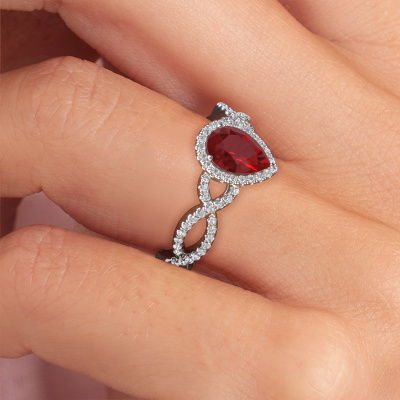 This platinum ring is called Dionne pear and is set with 7x5 mm ruby. Does your girlfriend fancy exclusive jewelry? Or would you like to show her that she deserves the finest jewelry? This platinum ring is pure craftsmanship, love and passion combined with the latest techniques coming together in perfect harmony. It requires a keen eye, patience and a skillful hand to mold this ring into perfection. Just the job for our expert goldsmith! The ruby set gemstones gives this platinum ring an extra glamorous appearance. Customize the style of the twist engagement ring to her liking with a wide variety of precious metals and gemstones which you select. That is how you create a unique ring for the most exclusive woman in your life! This jewel is created to add sparkle to your finger, each jewel is lovingly made by hand by our goldsmiths.Are you on a budget? Please feel free to contact us, so we can go discuss your options. We offer our engagement rings at guaranteed best price, because we make them to order. You won't find such a price anywhere else!Different styles of new rings are made daily by our team. Perhaps you have found a pavé solitaire engagement ring somewhere. One you would like to give to your loved one. Please feel free to share your thoughts and design with our jewel designers. We would love to turn your design into a exclusive engagement ring. You can follow the development of your ring design because we use very detailed 3D drawings. On top of that, you can order a dummy of the design. A dummy is a plastic ring, which can be shaped according your ring design. You can try it on and check if the engagement ring is up to standard. We will gladly send you a non-binding offer, based on a fair price/ quality ratio. The offer will baffle you, considering the quality of the ring and gemstones.To make it easier for you, we offer a 30 day return policy. Check our terms and conditions.