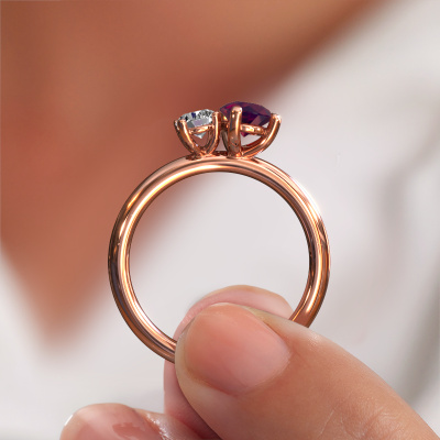 This 14 Carat rose gold ring is called Toi et Moi PER-RND and is set with rhodolite. How would you describe the style of the love of your life? Does she have a unique sense of style? This stunning sublime rose gold engagement ring can be custom made to your own or her liking. Our rhodolite gemstones have been carefully selected because we believe your fantasy engagement ring must be adorned with nothing but the most beautiful gemstone. Don't you agree? This jewel is unique in every way! Simply customize to your liking,By using our modern techniques, we can design and customize the finest quality jewels with the utmost care for you. Our engagement rings are always priced 30 percent lower than other jewelers. We make engagement rings to order so we don't have to maintain a large stock. If you have a certain budget, we are more than happy to advice you accordingly.Our designers and goldsmiths work together each day, creating new jewels. Perhaps you have found a nice fantasy engagement ring somewhere, which can be used to customize your unique ring. Please feel free to contact us. We will make you an offer, based on a fair price/ quality ratio, which will amaze you.To make it easier for you, we offer a 30 day return policy. Check our terms and conditions.