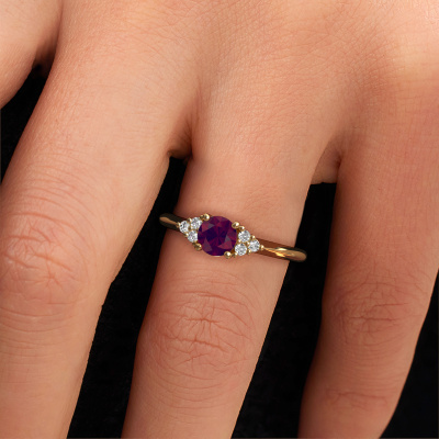 This 14 Carat gold ring is called Felipa RND and is set with 5 mm rhodolite. What is it that makes your relationship unique? What is it about her that makes you want to bend down on one knee? The unique bond between the two of you is emphasized by an equally unique ring. A one of a kind ajour 3-stone engagement ring made especially for her. That is why this fantasy ring fits her like a glove. Each specific detail of this ajour gold rhodolite set engagement ring is hand-picked, crafted and polished by our expert goldsmith. The result is an exquisite ring, unique and perfectly crafted to perfection. That is what our expert Goldsmiths strive for. This jewel is made just for you by our master goldsmiths in our own studio.After receiving your order, our goldsmiths will passionately start the creative process of making your engagement ring in our own studio. Because we don't have a big stockpile, these costs will not be passed on to you. Our pricing is proof of that! We offer top quality jewels at lowest price, guaranteed.Have you found a specific engagement ring somewhere which you would like to give to your loved one? Please feel free to express your wishes to our jewel designers because we would be honored to turn your design into a fantasy engagement ring. You can follow the development of your ring design because we use 3D drawings. This gives you a realistic preview of how your design will look. You can also preorder a dummy. A dummy is a plastic ring, which can be shaped according your ring design. You can try it on and check if its width and size are suitable for you. We will gladly send you a non-binding offer, based on a fair price/ quality ratio. It will amaze you, considering the quality of the ring and gemstones.To make it easier for you, we offer a 30 day return policy. Check our terms and conditions.