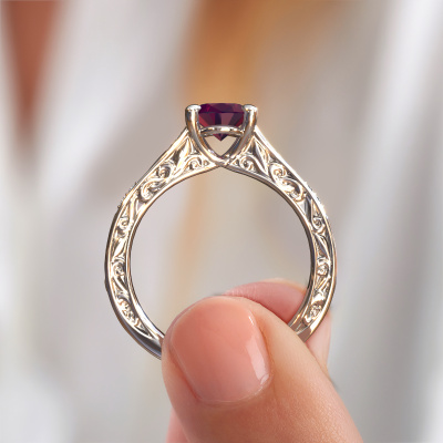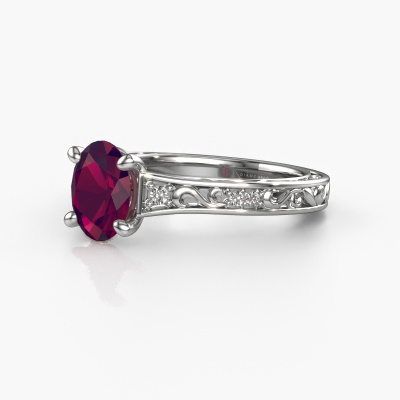 The ring shown above is called the Mallory ovl. We call this type of ring a pavé solitaire ring because it has one center gemstone and a band that is also pave set with gemstones. This engagement ring is made in platinum set with a 8x6 mm oval rhodolite, and pave set lab grown diamonds at the sides. Each piece of jewelry is made with passion and love by one of our master goldsmiths.This traditional platinum pavé solitaire engagement ring has an exquisite oval rhodolite center stone. To further accentuate the center stone, the band is set full with more lab grown diamonds. Its open prong setting allows light to strike the rhodolite from various angles and this adds sparkle to your rhodolite ring. The photo shown above depicts the goldsmith's carefully handcrafted details of the ring. The high positioning of the center stone is truly eye-catching. The perfect engagement ring for the crown jewel of your life!Are you on a budget? Please feel free to contact us, so we can go discuss your options. We offer our engagement rings at guaranteed best price, because we make them to order. You won't find such a price anywhere else!Our team adds new designs to our online collection daily. Our designers and goldsmiths work together in creating the best design. We strive to offer a diverse collection of jewels. Perhaps you have a specific jewel design in mind. One you came across somewhere. Please contact us for a free consultation. We will make you an offer, based on a fair price/ quality ratio, that will baffle you.To make it easier for you, we offer a 30 day return policy. Check our terms and conditions.