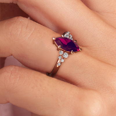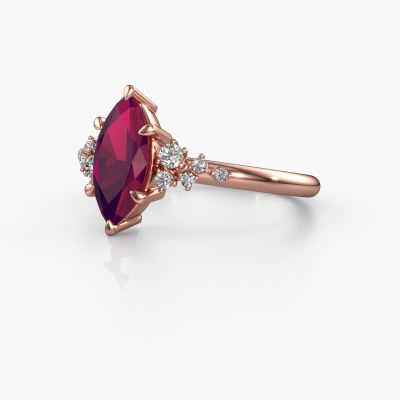 The ring shown above is called the Royce MRQ. We call this type of ring a pavé solitaire ring because it has one center gemstone and a band that is also pave set with gemstones. This engagement ring is made in 14 Carat rose gold set with a 11x5.5