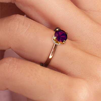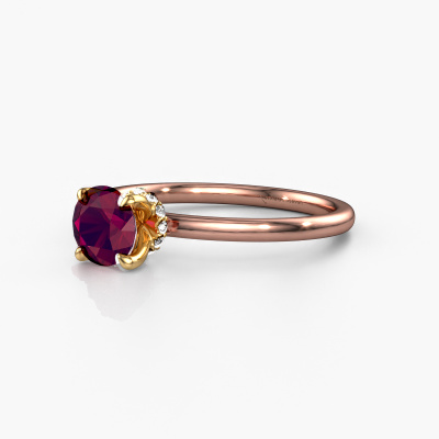 The ring shown above is called the Crystal RND 3, we call this a solitaire ring because it contains a single gemstone. The engagement ring is made in 14 Carat rose gold and has a round rhodolite of 5.5 mm. The cool thing about our configurator is that you can compile your own piece of jewelry, into a completely personalized one. This solitaire ring is crafted in the precious metals rose gold with gold, but of course you are free to pick your own colors. Each piece of jewelry is made with passion and love by one of our master goldsmiths.The solitaire ring is a special type of engagement ring. Its open prong setting allows light to strike the gemstone from various angles. This classic engagement ring is a stunning eye-catcher because of the high positioning of the gemstone. In order for you to commemorate your proposal with a unique ring, we carefully adorn this solitaire ring by hand. The love of your life deserves nothing but the best. By using a combination of the latest modern techniques, combined with ancient crafting, we can make all our engagement rings in our own studio. Each jewel is made to order. This is advantageous because we can offer you a price you won't find anywhere else.Different styles of new rings are made daily by our team. Perhaps you have found a solitaire engagement ring somewhere. One you would like to give to your loved one. Please feel free to share your thoughts and design with our jewel designers. We would love to turn your design into a classic engagement ring. You can follow the development of your ring design because we use very detailed 3D drawings. On top of that, you can order a dummy of the design. A dummy is a plastic ring, which can be shaped according your ring design. You can try it on and check if the engagement ring is up to standard. We will gladly send you a non-binding offer, based on a fair price/ quality ratio. The offer will baffle you, considering the quality of the ring and gemstones.To make it easier for you, we offer a 30 day return policy. Check our terms and conditions.
