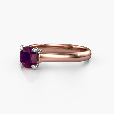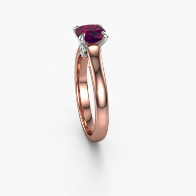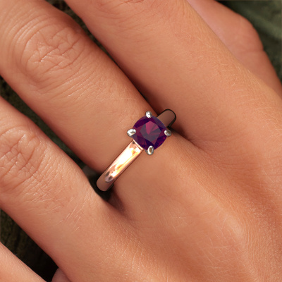 The ring shown above is called the Valorie cus 1, we call this a solitaire ring because it contains a single gemstone. The engagement ring is made in 14 Carat rose gold and has a cushion rhodolite of 6 mm. The cool thing about our configurator is that you can compile your own piece of jewelry, into a completely personalized one. This solitaire ring is crafted in the precious metals rose gold with white gold, but of course you are free to pick your own colors. Each piece of jewelry is made to shine bright around your finger. Each jewel is hand made with love by our goldsmiths.The solitaire ring is a special type of engagement ring. Its open prong setting allows light to strike the gemstone from various angles. This classic engagement ring is a stunning eye-catcher because of the high positioning of the gemstone. In order for you to commemorate your proposal with a unique ring, we carefully adorn this solitaire ring by hand. The love of your life deserves nothing but the best. Are you on a budget? Please feel free to contact us, so we can go discuss your options. We offer our engagement rings at guaranteed best price, because we make them to order. You won't find such a price anywhere else!Have you found a specific engagement ring somewhere which you would like to give to your loved one? Please feel free to express your wishes to our jewel designers because we would be honored to turn your design into a classic engagement ring. You can follow the development of your ring design because we use 3D drawings. This gives you a realistic preview of how your design will look. You can also preorder a dummy. A dummy is a plastic ring, which can be shaped according your ring design. You can try it on and check if its width and size are suitable for you. We will gladly send you a non-binding offer, based on a fair price/ quality ratio. It will amaze you, considering the quality of the ring and gemstones.To make it easier for you, we offer a 30 day return policy. Check our terms and conditions.