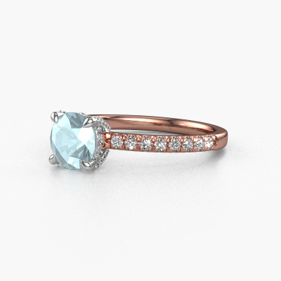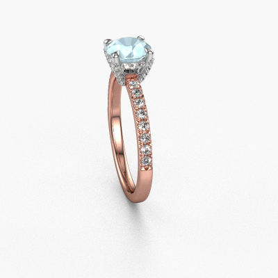 The ring shown above is called the Saskia rnd 1. We call this type of ring a pavé solitaire ring because it has one center gemstone and a band that is also pave set with gemstones. The 14 Carat rose gold engagement ring is set with a round 6.5 mm aquamarine center stone and the band is pave set with lab-grown diamond gemstones. Each jewel is made with passion and love by one of our master goldsmiths.This exclusive rose gold pavé solitaire engagement ring has an exquisite round aquamarine center stone. To further accentuate the center stone, the band is fully set with more lab grown diamonds. Its open prong setting allows light to strike the aquamarine from various angles and this adds sparkle to your aquamarine ring. The photo shown above depicts the goldsmith's carefully handcrafted details of the ring. The high positioning of the center stone is truly eye-catching. The perfect engagement ring for the crown jewel of your life! By using a combination of the latest modern techniques, combined with ancient crafting, we can make all our engagement rings in our own studio. Each jewel is made to order. This is advantageous because we can offer you a price you won't find anywhere else.Do you have a specific ring in mind? One you came across somewhere. Please feel free to tell us your wishes and we will turn your design into a unique engagement ring. You can follow the development of your ring design because we use 3D drawings. This gives you a realistic preview of your design. We will gladly send you a non-binding offer, based on a fair price/ quality ratio. It will amaze you.To make it easier for you, we offer a 30 day return policy. Check our terms and conditions.