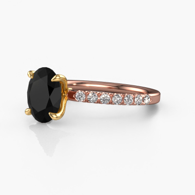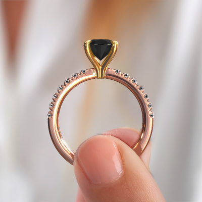 The ring shown above is called the Crystal OVL 2. We call this type of ring a pavé solitaire ring because it has one center gemstone and a band that is also pave set with gemstones. The 14 Carat rose gold engagement ring is set with a oval 2.16 crt black diamond center stone and the band is pave set with lab-grown diamond gemstones. Each jewel is made just for you by our master goldsmiths in our own studio.This exclusive rose gold pavé solitaire engagement ring has an exquisite oval black diamond center stone. To further accentuate the center stone, the band is fully set with more lab grown diamonds. Its open prong setting allows light to strike the black diamond from various angles and this adds sparkle to your black diamond ring. The photo shown above depicts the goldsmith's carefully handcrafted details of the ring. The high positioning of the center stone is truly eye-catching. The perfect engagement ring for the crown jewel of your life! By using a combination of the latest modern techniques, combined with ancient crafting, we can make all our engagement rings in our own studio. Each jewel is made to order. This is advantageous because we can offer you a price you won't find anywhere else.Our team adds new designs to our online collection daily. Our designers and goldsmiths work together in creating the best design. We strive to offer a diverse collection of jewels. Perhaps you have a specific jewel design in mind. One you came across somewhere. Please contact us for a free consultation. We will make you an offer, based on a fair price/ quality ratio, that will baffle you.To make it easier for you, we offer a 30 day return policy. Check our terms and conditions.