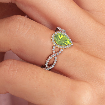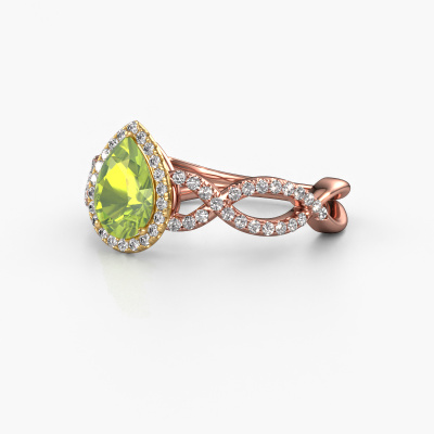 This 14 Carat rose gold ring is called Dionne pear and is set with 7x5 mm peridot. Does your girlfriend fancy exclusive jewelry? Or would you like to show her that she deserves the finest jewelry? This rose gold ring is pure craftsmanship, love and passion combined with the latest techniques coming together in perfect harmony. It requires a keen eye, patience and a skillful hand to mold this ring into perfection. Just the job for our expert goldsmith! The peridot set gemstones gives this rose gold ring an extra glamorous appearance. Customize the style of the twist engagement ring to her liking with a wide variety of precious metals and gemstones which you select. That is how you create a unique ring for the most exclusive woman in your life! This jewel is created to add sparkle to your finger, each jewel is lovingly made by hand by our goldsmiths.Are you on a budget? Please feel free to contact us, so we can go discuss your options. We offer our engagement rings at guaranteed best price, because we make them to order. You won't find such a price anywhere else!Different styles of new rings are made daily by our team. Perhaps you have found a pavé solitaire engagement ring somewhere. One you would like to give to your loved one. Please feel free to share your thoughts and design with our jewel designers. We would love to turn your design into a exclusive engagement ring. You can follow the development of your ring design because we use very detailed 3D drawings. On top of that, you can order a dummy of the design. A dummy is a plastic ring, which can be shaped according your ring design. You can try it on and check if the engagement ring is up to standard. We will gladly send you a non-binding offer, based on a fair price/ quality ratio. The offer will baffle you, considering the quality of the ring and gemstones.To make it easier for you, we offer a 30 day return policy. Check our terms and conditions.