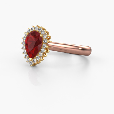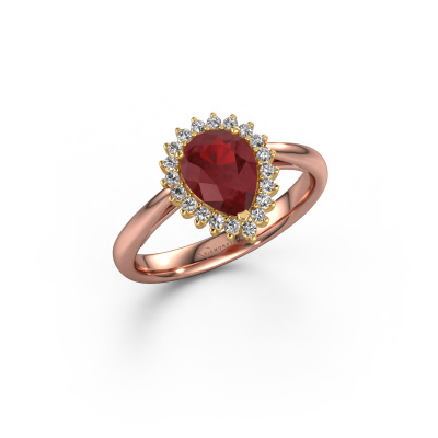 The ring shown above is called the Tilly per 1. We call this type of ring a cluster ring, the center gemstone is surrounded by smaller sized stones. This 14 Carat rose gold version is set with a 8x6 mm pear ruby center stone, embraced by smaller diamonds. The exclusive rose gold cluster engagement ring stands out because of its shape. Together, the smaller and bigger sized ruby gemstones form a flower and they appear to collide into one big sparkling gem. This exclusive engagement ring is also known as the flower ring. Our expert Goldsmiths make sure the smaller diamonds stones are set identically so there is no light interference in the ruby but unity instead. With perfect precision and a skillful hand each ruby is set in the ring. During manufacturing, it is constantly monitored to make sure light reflects flawlessly. This results in a unique engagement ring, with a radiant ruby at its centre. A lovely, meaningful gift to bestow upon the love of your life. After receiving your order, our goldsmiths will start the creative process of making your Tilly per 1 engagement ring. We don't keep stock. This is advantageous because these costs will not be passed on to you. Therefore, we can offer jewelry at exceptionally low prices.Our team adds new designs to our online collection daily. Our designers and goldsmiths work together in creating the best design. We strive to offer a diverse collection of jewels. Perhaps you have a specific jewel design in mind. One you came across somewhere. Please contact us for a free consultation. We will make you an offer, based on a fair price/ quality ratio, that will baffle you.To make it easier for you, we offer a 30 day return policy. Check our terms and conditions.
