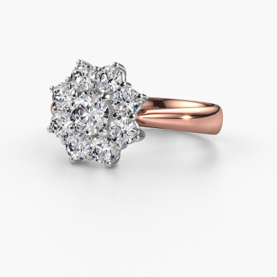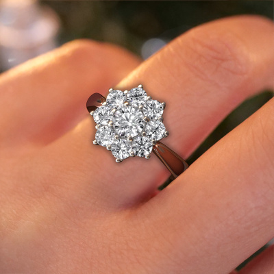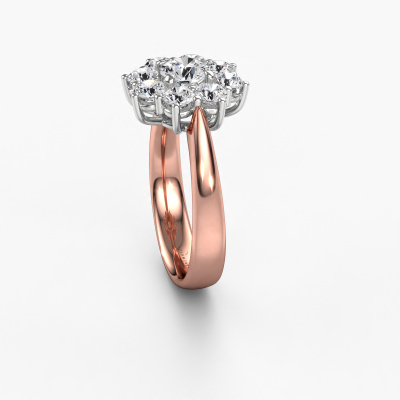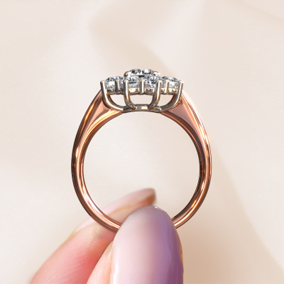The ring shown above is called the Carolyn 1. We call this type of ring a cluster ring, the center gemstone is surrounded by smaller sized stones. This 14 Carat rose gold version is set with a 0.50 crt round diamond center stone, embraced by smaller diamonds. The traditional rose gold cluster engagement ring stands out because of its shape. Together, the smaller and bigger sized diamond gemstones form a flower and they appear to collide into one big sparkling gem. This traditional engagement ring is also known as the flower ring. Our expert Goldsmiths make sure the smaller diamonds stones are set identically so there is no light interference in the diamond but unity instead. With perfect precision and a skillful hand each diamond is set in the ring. During manufacturing, it is constantly monitored to make sure light reflects flawlessly. This results in a unique engagement ring, with a radiant diamond at its centre. A lovely, meaningful gift to bestow upon the love of your life. By using our modern techniques, we can design and customize the finest quality jewels with the utmost care for you. Our engagement rings are always priced 30 percent lower than other jewelers. We make engagement rings to order so we don't have to maintain a large stock. If you have a certain budget, we are more than happy to advice you accordingly.Do you have a specific ring in mind? One you came across somewhere. Please feel free to tell us your wishes and we will turn your design into a unique engagement ring. You can follow the development of your ring design because we use 3D drawings. This gives you a realistic preview of your design. We will gladly send you a non-binding offer, based on a fair price/ quality ratio. It will amaze you.To make it easier for you, we offer a 30 day return policy. Check our terms and conditions.