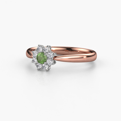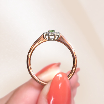The ring shown above is called the Carolyn 1. We call this type of ring a cluster ring, the center gemstone is surrounded by smaller sized stones. This 14 Carat rose gold version is set with a 3 mm round tourmaline green center stone, embraced by smaller diamonds. The traditional rose gold cluster engagement ring stands out because of its shape. Together, the smaller and bigger sized tourmaline green gemstones form a flower and they appear to collide into one big sparkling gem. This traditional engagement ring is also known as the flower ring. Our expert Goldsmiths make sure the smaller diamonds stones are set identically so there is no light interference in the tourmaline green but unity instead. With perfect precision and a skillful hand each tourmaline green is set in the ring. During manufacturing, it is constantly monitored to make sure light reflects flawlessly. This results in a unique engagement ring, with a radiant tourmaline green at its centre. A lovely, meaningful gift to bestow upon the love of your life. By using our modern techniques, we can design and customize the finest quality jewels with the utmost care for you. Our engagement rings are always priced 30 percent lower than other jewelers. We make engagement rings to order so we don't have to maintain a large stock. If you have a certain budget, we are more than happy to advice you accordingly.Do you have a specific ring in mind? One you came across somewhere. Please feel free to tell us your wishes and we will turn your design into a unique engagement ring. You can follow the development of your ring design because we use 3D drawings. This gives you a realistic preview of your design. We will gladly send you a non-binding offer, based on a fair price/ quality ratio. It will amaze you.To make it easier for you, we offer a 30 day return policy. Check our terms and conditions.