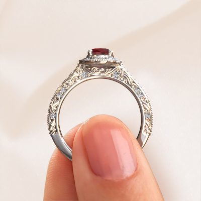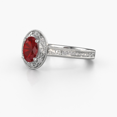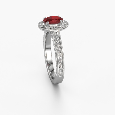 This platinum ring is called Alice OVL and is set with 7x5 mm ruby. What is it that makes your relationship unique? What is it about her that makes you want to bend down on one knee? The unique bond between the two of you is emphasized by an equally unique ring. A one of a kind filigree halo engagement ring made especially for her. That is why this vintage ring fits her like a glove. Each specific detail of this filigree platinum ruby set engagement ring is hand-picked, crafted and polished by our expert goldsmith. The result is an exquisite ring, unique and perfectly crafted to perfection. That is what our expert Goldsmiths strive for. This jewel is made with passion and love by one of our master goldsmiths.By using our modern techniques, we can design and customize the finest quality jewels with the utmost care for you. Our engagement rings are always priced 30 percent lower than other jewelers. We make engagement rings to order so we don't have to maintain a large stock. If you have a certain budget, we are more than happy to advice you accordingly.Our team adds new designs to our online collection daily. Our designers and goldsmiths work together in creating the best design. We strive to offer a diverse collection of jewels. Perhaps you have a specific jewel design in mind. One you came across somewhere. Please contact us for a free consultation. We will make you an offer, based on a fair price/ quality ratio, that will baffle you.To make it easier for you, we offer a 30 day return policy. Check our terms and conditions.
