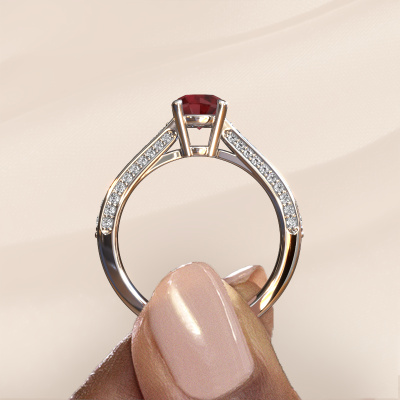 The ring shown above is called the Ruby rnd. We call this type of ring a pavé solitaire ring because it has one center gemstone and a band that is also pave set with gemstones. This engagement ring is made in platinum set with a 5.7 mm round ruby, and pave set diamonds at the sides. Each piece of jewelry is made just for you, with attention to detail and design.This exclusive platinum pavé solitaire engagement ring has an exquisite round ruby center stone. To further accentuate the center stone, the band is set full with more diamonds. Its open prong setting allows light to strike the ruby from various angles and this adds sparkle to your ruby ring. The photo shown above depicts the goldsmith's carefully handcrafted details of the ring. The high positioning of the center stone is truly eye-catching. The perfect engagement ring for the crown jewel of your life!Because we design and deliver our own rings, we can offer you a engagement ring at a price you won't find anywhere else. A ring is made to order, which helps prevent excess supplies, so we can make you a great price offer. We understand it feels risky, buying your engagement ring online, but we will gladly assist in the designing process, taking your budget into consideration.Do you have a specific ring in mind? One you came across somewhere. Please feel free to tell us your wishes and we will turn your design into a unique engagement ring. You can follow the development of your ring design because we use 3D drawings. This gives you a realistic preview of your design. We will gladly send you a non-binding offer, based on a fair price/ quality ratio. It will amaze you.To make it easier for you, we offer a 30 day return policy. Check our terms and conditions.