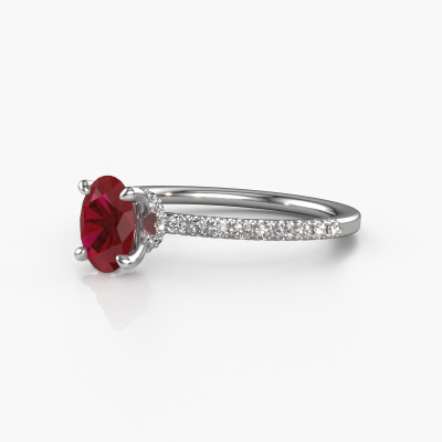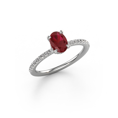 The ring shown above is called the Crystal OVL 4. We call this type of ring a pavé solitaire ring because it has one center gemstone and a band that is also pave set with gemstones. The platinum engagement ring is set with a oval 7x5 mm ruby center stone and the band is pave set with diamond gemstones. Each jewel is made with passion and love by one of our master goldsmiths.This contemporary platinum pavé solitaire engagement ring has an exquisite oval ruby center stone. To further accentuate the center stone, the band is fully set with more diamonds. Its open prong setting allows light to strike the ruby from various angles and this adds sparkle to your ruby ring. The photo shown above depicts the goldsmith's carefully handcrafted details of the ring. The high positioning of the center stone is truly eye-catching. The perfect engagement ring for the crown jewel of your life! After receiving your order, our goldsmiths will passionately start the creative process of making your engagement ring in our own studio. Because we don't have a big stockpile, these costs will not be passed on to you. Our pricing is proof of that! We offer top quality jewels at lowest price, guaranteed.Our team adds new designs to our online collection daily. Our designers and goldsmiths work together in creating the best design. We strive to offer a diverse collection of jewels. Perhaps you have a specific jewel design in mind. One you came across somewhere. Please contact us for a free consultation. We will make you an offer, based on a fair price/ quality ratio, that will baffle you.To make it easier for you, we offer a 30 day return policy. Check our terms and conditions.