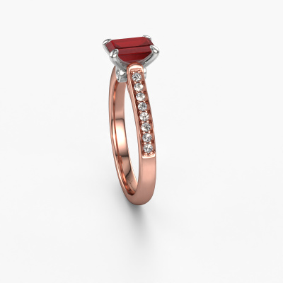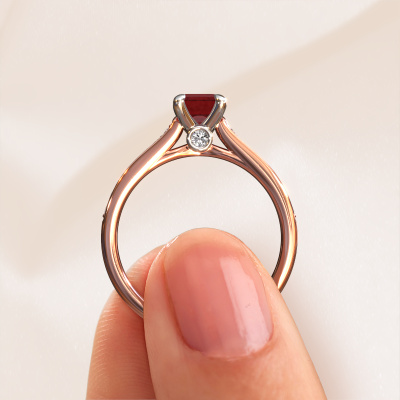 The ring shown above is called the Valorie eme 2. We call this type of ring a pavé solitaire ring because it has one center gemstone and a band that is also pave set with gemstones. The 14 Carat rose gold engagement ring is set with a emerald cut 6.5x4.5 mm ruby center stone and the band is pave set with diamond gemstones. Each jewel is made by a team of passionate goldsmiths and jewel designers. This will make your crown jewel truly eye-catching.This classic rose gold pavé solitaire engagement ring has an exquisite emerald cut ruby center stone. To further accentuate the center stone, the band is fully set with more diamonds. Its open prong setting allows light to strike the ruby from various angles and this adds sparkle to your ruby ring. The photo shown above depicts the goldsmith's carefully handcrafted details of the ring. The high positioning of the center stone is truly eye-catching. The perfect engagement ring for the crown jewel of your life! By using our modern techniques, we can design and customize the finest quality jewels with the utmost care for you. Our engagement rings are always priced 30 percent lower than other jewelers. We make engagement rings to order so we don't have to maintain a large stock. If you have a certain budget, we are more than happy to advice you accordingly.Have you found a specific engagement ring somewhere which you would like to give to your loved one? Please feel free to express your wishes to our jewel designers because we would be honored to turn your design into a classic engagement ring. You can follow the development of your ring design because we use 3D drawings. This gives you a realistic preview of how your design will look. You can also preorder a dummy. A dummy is a plastic ring, which can be shaped according your ring design. You can try it on and check if its width and size are suitable for you. We will gladly send you a non-binding offer, based on a fair price/ quality ratio. It will amaze you, considering the quality of the ring and gemstones.To make it easier for you, we offer a 30 day return policy. Check our terms and conditions.