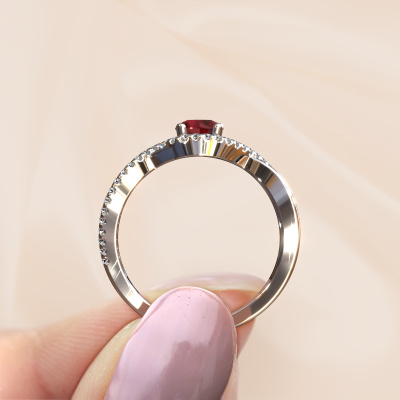 The ring shown above is called the Melody. We call this type of ring a pavé solitaire ring because it has one center gemstone and a band that is also pave set with gemstones. This engagement ring is made in 14 Carat white gold set with a 5 mm round ruby, and pave set diamonds at the sides. Each piece of jewelry is unique in every way! Simply customize to your likingThis classic white gold pavé solitaire engagement ring has an exquisite round ruby center stone. To further accentuate the center stone, the band is set full with more diamonds. Its open prong setting allows light to strike the ruby from various angles and this adds sparkle to your ruby ring. The photo shown above depicts the goldsmith's carefully handcrafted details of the ring. The high positioning of the center stone is truly eye-catching. The perfect engagement ring for the crown jewel of your life!Because we design and deliver our own rings, we can offer you a engagement ring at a price you won't find anywhere else. A ring is made to order, which helps prevent excess supplies, so we can make you a great price offer. We understand it feels risky, buying your engagement ring online, but we will gladly assist in the designing process, taking your budget into consideration.Do you have a specific ring in mind? One you came across somewhere. Please feel free to tell us your wishes and we will turn your design into a unique engagement ring. You can follow the development of your ring design because we use 3D drawings. This gives you a realistic preview of your design. We will gladly send you a non-binding offer, based on a fair price/ quality ratio. It will amaze you.To make it easier for you, we offer a 30 day return policy. Check our terms and conditions.