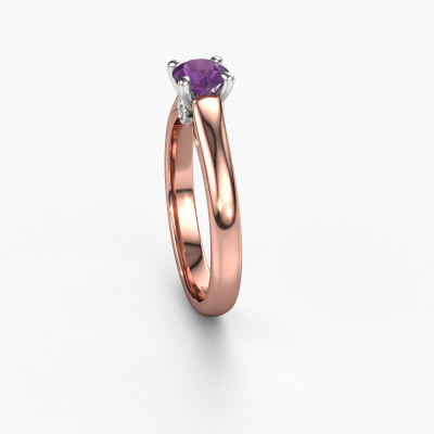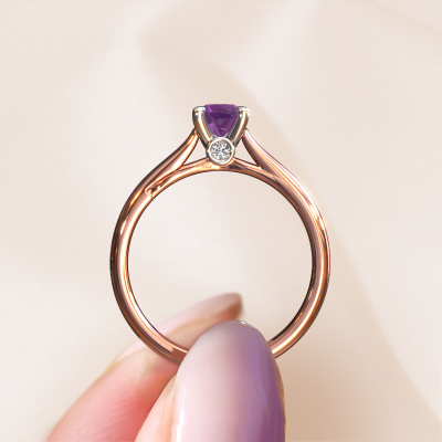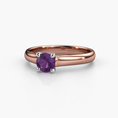 The ring shown above is called the Valorie RND 1, we call this a solitaire ring because it contains a single gemstone. The engagement ring is made in 14 Carat rose gold and has a round amethyst of 5 mm. This modern rose gold solitaire ring with exquisite round amethyst is a beautiful engagement ring. The open prong setting allows light to strike the gemstone from various angles. The ring also stands out because of the high positioning of the gemstone. Because diamonds symbolize true love and purity, they make the perfect gift for the love of your life. The symbol of eternal love is the centerpiece of this solitaire ring. Like a diamond, all other types of precious metal have their own attributed symbolic meaning. You can compile the solitaire engagement ring yourself in various precious metal combinations. This one has the combination of 14 Carat rose gold with white gold. Each piece of jewelry is made just for you, with attention to detail and design.By using our modern techniques, we can design and customize the finest quality jewels with the utmost care for you. Our engagement rings are always priced 30 percent lower than other jewelers. We make engagement rings to order so we don't have to maintain a large stock. If you have a certain budget, we are more than happy to advice you accordingly.Do you have a specific ring in mind? One you came across somewhere. Please feel free to tell us your wishes and we will turn your design into a unique engagement ring. You can follow the development of your ring design because we use 3D drawings. This gives you a realistic preview of your design. We will gladly send you a non-binding offer, based on a fair price/ quality ratio. It will amaze you.To make it easier for you, we offer a 30 day return policy. Check our terms and conditions.