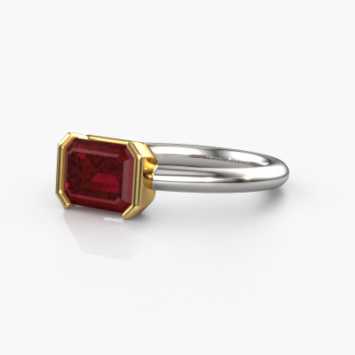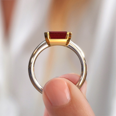 The ring shown above is called the Tayler EME, we call this a solitaire ring because it contains a single gemstone. The engagement ring is made in 14 Carat white gold and has a emerald cut ruby of 8x6 mm. This modern white gold solitaire ring with exquisite emerald cut ruby is a beautiful engagement ring. The open prong setting allows light to strike the gemstone from various angles. The ring also stands out because of the high positioning of the gemstone. Because diamonds symbolize true love and purity, they make the perfect gift for the love of your life. The symbol of eternal love is the centerpiece of this solitaire ring. Like a diamond, all other types of precious metal have their own attributed symbolic meaning. You can compile the solitaire engagement ring yourself in various precious metal combinations. This one has the combination of 14 Carat white gold with gold. Each piece of jewelry is created to add sparkle to your finger, each jewel is lovingly made by hand by our goldsmiths.After receiving your order, our goldsmiths will passionately start the creative process of making your engagement ring in our own studio. Because we don't have a big stockpile, these costs will not be passed on to you. Our pricing is proof of that! We offer top quality jewels at lowest price, guaranteed.Our designers and goldsmiths work together each day, creating new jewels. Perhaps you have found a nice modern engagement ring somewhere, which can be used to customize your unique ring. Please feel free to contact us. We will make you an offer, based on a fair price/ quality ratio, which will amaze you.To make it easier for you, we offer a 30 day return policy. Check our terms and conditions.
