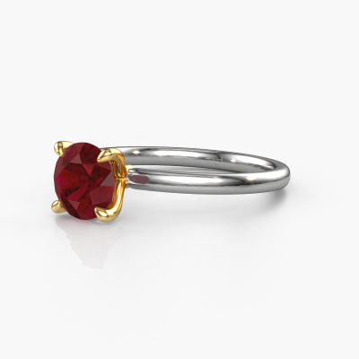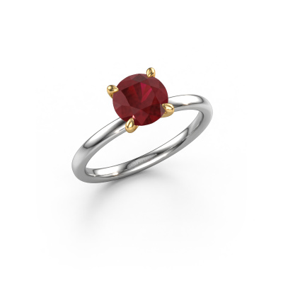 The ring shown above is called the Crystal RND 1, we call this a solitaire ring because it contains a single gemstone. The engagement ring is made in 14 Carat white gold and has a round ruby of 6.8 mm. This classic white gold solitaire ring with exquisite round ruby is a beautiful engagement ring. The open prong setting allows light to strike the gemstone from various angles. The ring also stands out because of the high positioning of the gemstone. Because diamonds symbolize true love and purity, they make the perfect gift for the love of your life. The symbol of eternal love is the centerpiece of this solitaire ring. Like a diamond, all other types of precious metal have their own attributed symbolic meaning. You can compile the solitaire engagement ring yourself in various precious metal combinations. This one has the combination of 14 Carat white gold with gold. Each piece of jewelry is made by a team of passionate goldsmiths and jewel designers. This will make your crown jewel truly eye-catching.After receiving your order, our goldsmiths will passionately start the creative process of making your engagement ring in our own studio. Because we don't have a big stockpile, these costs will not be passed on to you. Our pricing is proof of that! We offer top quality jewels at lowest price, guaranteed.Do you have a specific ring in mind? One you came across somewhere. Please feel free to tell us your wishes and we will turn your design into a unique engagement ring. You can follow the development of your ring design because we use 3D drawings. This gives you a realistic preview of your design. We will gladly send you a non-binding offer, based on a fair price/ quality ratio. It will amaze you.To make it easier for you, we offer a 30 day return policy. Check our terms and conditions.
