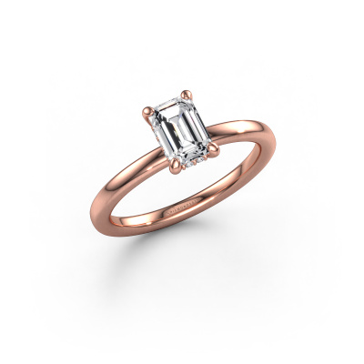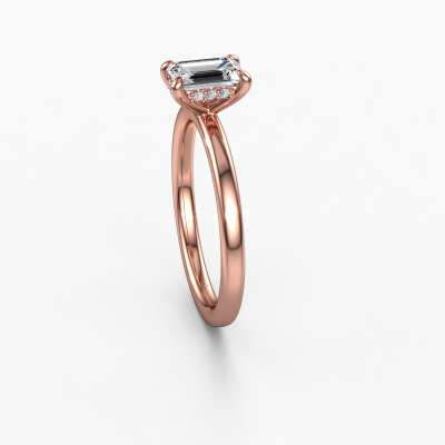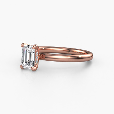 The ring shown above is called the Simone EME 2. We call this a solitaire ring because it contains a single gemstone. The engagement ring is made in 14 Carat rose gold and has a emerald cut lab-grown diamond of 0.90 crt. This extraordinary traditional rose gold solitaire engagement ring is set with a beautiful emerald cut lab-grown diamond to add sparkle to your proposal. The open prong setting allows light to strike the gemstone from various angles. Did you know a diamond represents everlasting love and fidelity? This makes it a perfect centerpiece. Our goldsmith carefully positions the gemstone of your choosing high on top of the ring, which makes it stand out. Each piece of jewelry is made by a team of passionate goldsmiths and jewel designers. This will make your crown jewel truly eye-catching.By using our modern techniques, we can design and customize the finest quality jewels with the utmost care for you. Our engagement rings are always priced 30 percent lower than other jewelers. We make engagement rings to order so we don't have to maintain a large stock. If you have a certain budget, we are more than happy to advice you accordingly.Do you have a specific ring in mind? One you came across somewhere. Please feel free to tell us your wishes and we will turn your design into a unique engagement ring. You can follow the development of your ring design because we use 3D drawings. This gives you a realistic preview of your design. We will gladly send you a non-binding offer, based on a fair price/ quality ratio. It will amaze you.To make it easier for you, we offer a 30 day return policy. Check our terms and conditions.