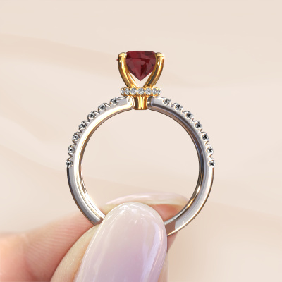 The ring shown above is called the Crystal rnd 4. We call this type of ring a pavé solitaire ring because it has one center gemstone and a band that is also pave set with gemstones. The 14 Carat white gold engagement ring is set with a round 7 mm ruby center stone and the band is pave set with lab-grown diamond gemstones. Each jewel is made to shine bright around your finger. Each jewel is hand made with love by our goldsmiths.This fantasy white gold pavé solitaire engagement ring has an exquisite round ruby center stone. To further accentuate the center stone, the band is fully set with more lab grown diamonds. Its open prong setting allows light to strike the ruby from various angles and this adds sparkle to your ruby ring. The photo shown above depicts the goldsmith's carefully handcrafted details of the ring. The high positioning of the center stone is truly eye-catching. The perfect engagement ring for the crown jewel of your life! By using our modern techniques, we can design and customize the finest quality jewels with the utmost care for you. Our engagement rings are always priced 30 percent lower than other jewelers. We make engagement rings to order so we don't have to maintain a large stock. If you have a certain budget, we are more than happy to advice you accordingly.Have you found a specific engagement ring somewhere which you would like to give to your loved one? Please feel free to express your wishes to our jewel designers because we would be honored to turn your design into a fantasy engagement ring. You can follow the development of your ring design because we use 3D drawings. This gives you a realistic preview of how your design will look. You can also preorder a dummy. A dummy is a plastic ring, which can be shaped according your ring design. You can try it on and check if its width and size are suitable for you. We will gladly send you a non-binding offer, based on a fair price/ quality ratio. It will amaze you, considering the quality of the ring and gemstones.To make it easier for you, we offer a 30 day return policy. Check our terms and conditions.