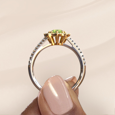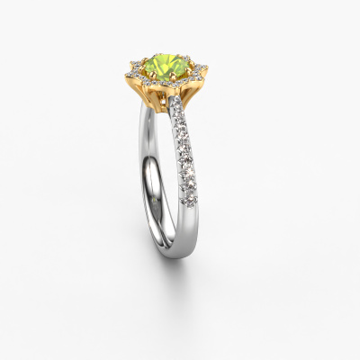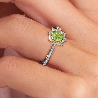 This 14 Carat white gold ring is called Zena and is set with peridot. An extraordinary white gold vintage ring. One that will surely make the love of your life shine like a diamond! That is what we hope to achieve. This fantasy engagement ring is