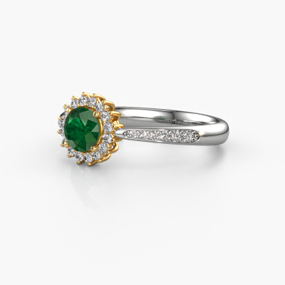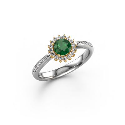 The ring shown above is called the Tilly RND 2. We call this type of ring a cluster ring, the center gemstone is surrounded by smaller sized stones. This 14 Carat white gold version is set with a 5 mm round emerald center stone, embraced by smaller diamonds. If you look at this white gold cluster engagement ring, you might get the impression that its smaller sized stones collide with the bigger emerald, so it is shaped like a flower. Therefore this engagement ring is also known as the flower ring. Our artisan goldsmiths get the job done. Each individual stone is carefully set by hand. During manufacturing, light fall is constantly monitored to make sure the special cluster effect is still visible. In the end you get the perfect engagement ring with a radiant emerald gemstone centerpiece. You can imagine the effect of a ring of such significance when you give tot the love of your life on her special day to shine. After receiving your order, our goldsmiths will start the creative process of making your Tilly RND 2 engagement ring. We don't keep stock. This is advantageous because these costs will not be passed on to you. Therefore, we can offer jewelry at exceptionally low prices.Our team adds new designs to our online collection daily. Our designers and goldsmiths work together in creating the best design. We strive to offer a diverse collection of jewels. Perhaps you have a specific jewel design in mind. One you came across somewhere. Please contact us for a free consultation. We will make you an offer, based on a fair price/ quality ratio, that will baffle you.To make it easier for you, we offer a 30 day return policy. Check our terms and conditions.