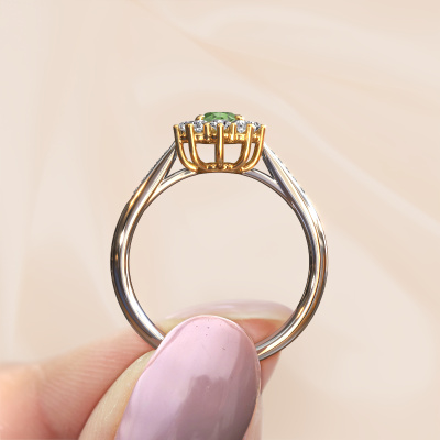 The ring shown above is called the Leesa 2. We call this type of ring a cluster ring, the center gemstone is surrounded by smaller sized stones. This 14 Carat white gold version is set with a 6x4 mm oval tourmaline green center stone, embraced by smaller diamonds. The classic white gold cluster engagement ring stands out because of its shape. Together, the smaller and bigger sized tourmaline green gemstones form a flower and they appear to collide into one big sparkling gem. This classic engagement ring is also known as the flower ring. Our expert Goldsmiths make sure the smaller diamonds stones are set identically so there is no light interference in the tourmaline green but unity instead. With perfect precision and a skillful hand each tourmaline green is set in the ring. During manufacturing, it is constantly monitored to make sure light reflects flawlessly. This results in a unique engagement ring, with a radiant tourmaline green at its centre. A lovely, meaningful gift to bestow upon the love of your life. Are you on a budget? Please feel free to contact us, so we can go discuss your options. We offer our engagement rings at guaranteed best price, because we make them to order. You won't find such a price anywhere else!Our designers and goldsmiths work together each day, creating new jewels. Perhaps you have found a nice classic engagement ring somewhere, which can be used to customize your unique ring. Please feel free to contact us. We will make you an offer, based on a fair price/ quality ratio, which will amaze you.To make it easier for you, we offer a 30 day return policy. Check our terms and conditions.