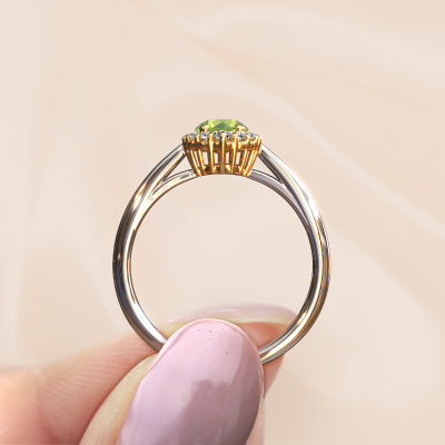 The ring shown above is called the Tora. We call this type of ring a cluster ring, the center gemstone is surrounded by smaller sized stones. This 14 Carat white gold version is set with a 5 mm round peridot center stone, embraced by smaller lab grown diamonds. The classic white gold cluster engagement ring stands out because of its shape. Together, the smaller and bigger sized peridot gemstones form a flower and they appear to collide into one big sparkling gem. This classic engagement ring is also known as the flower ring. Our expert Goldsmiths make sure the smaller lab grown diamonds stones are set identically so there is no light interference in the peridot but unity instead. With perfect precision and a skillful hand each peridot is set in the ring. During manufacturing, it is constantly monitored to make sure light reflects flawlessly. This results in a unique engagement ring, with a radiant peridot at its centre. A lovely, meaningful gift to bestow upon the love of your life. By using a combination of the latest modern techniques, combined with ancient crafting, we can make all our engagement rings in our own studio. Each jewel is made to order. This is advantageous because we can offer you a price you won't find anywhere else.Have you found a specific engagement ring somewhere which you would like to give to your loved one? Please feel free to express your wishes to our jewel designers because we would be honored to turn your design into a classic engagement ring. You can follow the development of your ring design because we use 3D drawings. This gives you a realistic preview of how your design will look. You can also preorder a dummy. A dummy is a plastic ring, which can be shaped according your ring design. You can try it on and check if its width and size are suitable for you. We will gladly send you a non-binding offer, based on a fair price/ quality ratio. It will amaze you, considering the quality of the ring and gemstones.To make it easier for you, we offer a 30 day return policy. Check our terms and conditions.