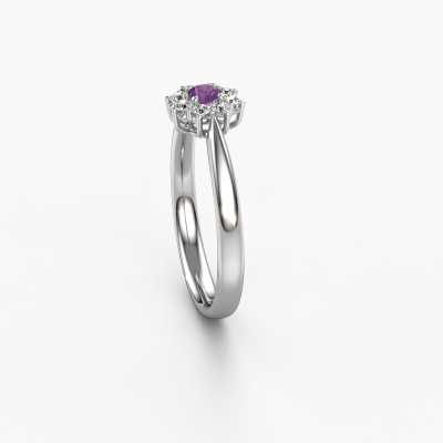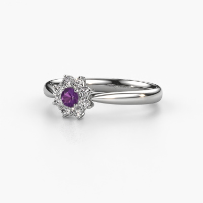 The ring shown above is called the Carolyn 1. We call this type of ring a cluster ring, the center gemstone is surrounded by smaller sized stones. This 14 Carat white gold version is set with a 3 mm round amethyst center stone, embraced by smaller diamonds. The traditional white gold cluster engagement ring stands out because of its shape. Together, the smaller and bigger sized amethyst gemstones form a flower and they appear to collide into one big sparkling gem. This traditional engagement ring is also known as the flower ring. Our expert Goldsmiths make sure the smaller diamonds stones are set identically so there is no light interference in the amethyst but unity instead. With perfect precision and a skillful hand each amethyst is set in the ring. During manufacturing, it is constantly monitored to make sure light reflects flawlessly. This results in a unique engagement ring, with a radiant amethyst at its centre. A lovely, meaningful gift to bestow upon the love of your life. By using our modern techniques, we can design and customize the finest quality jewels with the utmost care for you. Our engagement rings are always priced 30 percent lower than other jewelers. We make engagement rings to order so we don't have to maintain a large stock. If you have a certain budget, we are more than happy to advice you accordingly.Do you have a specific ring in mind? One you came across somewhere. Please feel free to tell us your wishes and we will turn your design into a unique engagement ring. You can follow the development of your ring design because we use 3D drawings. This gives you a realistic preview of your design. We will gladly send you a non-binding offer, based on a fair price/ quality ratio. It will amaze you.To make it easier for you, we offer a 30 day return policy. Check our terms and conditions.