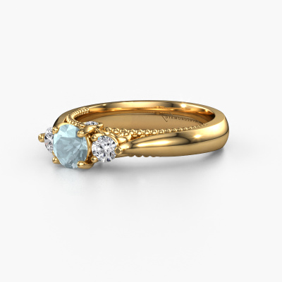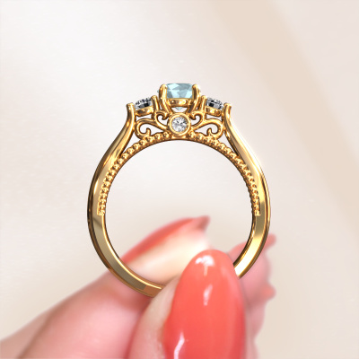 This 14 Carat gold ring is called Tiffani and is set with 5 mm aquamarine. This exclusive gold 3-stone engagement ring is a true work of art! The ornaments are crafted with a lot of patience and great passion. In order to create this ring with great precision, this craft requires a keen eye and skillful hand. A challenge which ignites a fire in our expert goldsmith. The exquisite aquamarine are set in a special way so they stand out even more. This gives the ring an even more glamorous appearance. The ajour engagement ring is actually unique on its own because of the gemstones which we carefully select especially for this ring. On top of that you select the precious metals which will be used to create a unique ring for the most extraordinary woman in your life! This jewel is made just for you by our master goldsmiths in our own studio.After receiving your order, our goldsmiths will passionately start the creative process of making your engagement ring in our own studio. Because we don't have a big stockpile, these costs will not be passed on to you. Our pricing is proof of that! We offer top quality jewels at lowest price, guaranteed.Have you found a specific engagement ring somewhere which you would like to give to your loved one? Please feel free to express your wishes to our jewel designers because we would be honored to turn your design into a unique engagement ring. You can follow the development of your ring design because we use 3D drawings. This gives you a realistic preview of how your design will look. You can also preorder a dummy. A dummy is a plastic ring, which can be shaped according your ring design. You can try it on and check if its width and size are suitable for you. We will gladly send you a non-binding offer, based on a fair price/ quality ratio. It will amaze you, considering the quality of the ring and gemstones.To make it easier for you, we offer a 30 day return policy. Check our terms and conditions.