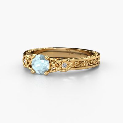 This 14 Carat gold ring is called Gillian and is set with 5 mm aquamarine. Is your girlfriend hooked on vintage? Then this gold ajour engagement ring will surely match her style perfectly. A trendy ring with just a hint of vintage adornment. A truly stunning, romantic design! Especially when you customize your ring to your own liking. This vintage 3-stone engagement ring is set with stunning aquamarine. As you can see, you are the boss in selecting a gemstone which matches the style of your girlfriend best. Each gemstone is carefully selected by our merchants whom are spread throughout the world. Nothing but the best gems for our expert goldsmith. After all, it is his crowning glory! Each jewel is made just for you, with attention to detail and design.After receiving your order, our goldsmiths will passionately start the creative process of making your engagement ring in our own studio. Because we don't have a big stockpile, these costs will not be passed on to you. Our pricing is proof of that! We offer top quality jewels at lowest price, guaranteed.Different styles of new rings are made daily by our team. Perhaps you have found a 3-stone engagement ring somewhere. One you would like to give to your loved one. Please feel free to share your thoughts and design with our jewel designers. We would love to turn your design into a vintage engagement ring. You can follow the development of your ring design because we use very detailed 3D drawings. On top of that, you can order a dummy of the design. A dummy is a plastic ring, which can be shaped according your ring design. You can try it on and check if the engagement ring is up to standard. We will gladly send you a non-binding offer, based on a fair price/ quality ratio. The offer will baffle you, considering the quality of the ring and gemstones.To make it easier for you, we offer a 30 day return policy. Check our terms and conditions.