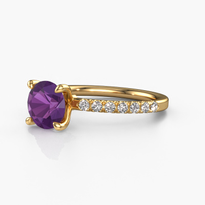 The ring shown above is called the Crystal RND 2. We call this type of ring a pavé solitaire ring because it has one center gemstone and a band that is also pave set with gemstones. The 14 Carat gold engagement ring is set with a round 7.3 mm amethyst center stone and the band is pave set with lab-grown diamond gemstones. Each jewel is unique in every way! Simply customize to your liking,This classic gold pavé solitaire engagement ring has an exquisite round amethyst center stone. To further accentuate the center stone, the band is fully set with more lab grown diamonds. Its open prong setting allows light to strike the amethyst from various angles and this adds sparkle to your amethyst ring. The photo shown above depicts the goldsmith's carefully handcrafted details of the ring. The high positioning of the center stone is truly eye-catching. The perfect engagement ring for the crown jewel of your life! After receiving your order, our goldsmiths will start the creative process of making your Crystal RND 2 engagement ring. We don't keep stock. This is advantageous because these costs will not be passed on to you. Therefore, we can offer jewelry at exceptionally low prices.Different styles of new rings are made daily by our team. Perhaps you have found a pavé solitaire engagement ring somewhere. One you would like to give to your loved one. Please feel free to share your thoughts and design with our jewel designers. We would love to turn your design into a classic engagement ring. You can follow the development of your ring design because we use very detailed 3D drawings. On top of that, you can order a dummy of the design. A dummy is a plastic ring, which can be shaped according your ring design. You can try it on and check if the engagement ring is up to standard. We will gladly send you a non-binding offer, based on a fair price/ quality ratio. The offer will baffle you, considering the quality of the ring and gemstones.To make it easier for you, we offer a 30 day return policy. Check our terms and conditions.