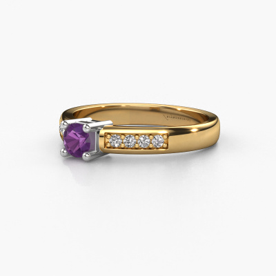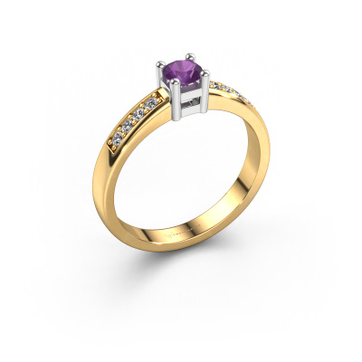 The ring shown above is called the Eline 2. We call this type of ring a pavé solitaire ring because it has one center gemstone and a band that is also pave set with gemstones. The 14 Carat gold engagement ring is set with a round 3.7 mm amethyst center stone and the band is pave set with diamond gemstones. Each jewel is unique in every way! Simply customize to your liking,This modern gold pavé solitaire engagement ring has an exquisite round amethyst center stone. To further accentuate the center stone, the band is fully set with more diamonds. Its open prong setting allows light to strike the amethyst from various angles and this adds sparkle to your amethyst ring. The photo shown above depicts the goldsmith's carefully handcrafted details of the ring. The high positioning of the center stone is truly eye-catching. The perfect engagement ring for the crown jewel of your life! Because we design and deliver our own rings, we can offer you a engagement ring at a price you won't find anywhere else. A ring is made to order, which helps prevent excess supplies, so we can make you a great price offer. We understand it feels risky, buying your engagement ring online, but we will gladly assist in the designing process, taking your budget into consideration.Our team adds new designs to our online collection daily. Our designers and goldsmiths work together in creating the best design. We strive to offer a diverse collection of jewels. Perhaps you have a specific jewel design in mind. One you came across somewhere. Please contact us for a free consultation. We will make you an offer, based on a fair price/ quality ratio, that will baffle you.To make it easier for you, we offer a 30 day return policy. Check our terms and conditions.