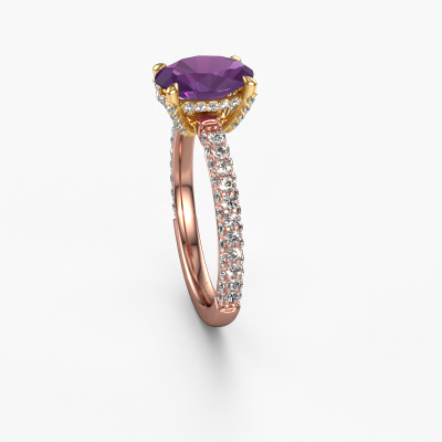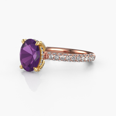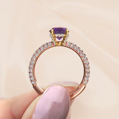 The ring shown above is called the Saskia 2 ovl. We call this type of ring a pavé solitaire ring because it has one center gemstone and a band that is also pave set with gemstones. The 14 Carat rose gold engagement ring is set with a oval 9x7 mm amethyst center stone and the band is pave set with lab-grown diamond gemstones. Each jewel is made just for you by our master goldsmiths in our own studio.This exclusive rose gold pavé solitaire engagement ring has an exquisite oval amethyst center stone. To further accentuate the center stone, the band is fully set with more lab grown diamonds. Its open prong setting allows light to strike the amethyst from various angles and this adds sparkle to your amethyst ring. The photo shown above depicts the goldsmith's carefully handcrafted details of the ring. The high positioning of the center stone is truly eye-catching. The perfect engagement ring for the crown jewel of your life! After receiving your order, our goldsmiths will passionately start the creative process of making your engagement ring in our own studio. Because we don't have a big stockpile, these costs will not be passed on to you. Our pricing is proof of that! We offer top quality jewels at lowest price, guaranteed.Have you found a specific engagement ring somewhere which you would like to give to your loved one? Please feel free to express your wishes to our jewel designers because we would be honored to turn your design into a exclusive engagement ring. You can follow the development of your ring design because we use 3D drawings. This gives you a realistic preview of how your design will look. You can also preorder a dummy. A dummy is a plastic ring, which can be shaped according your ring design. You can try it on and check if its width and size are suitable for you. We will gladly send you a non-binding offer, based on a fair price/ quality ratio. It will amaze you, considering the quality of the ring and gemstones.To make it easier for you, we offer a 30 day return policy. Check our terms and conditions.