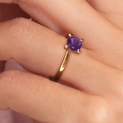 The ring shown above is called the Crystal CUS 1, we call this a solitaire ring because it contains a single gemstone. The engagement ring is made in 14 Carat gold and has a cushion amethyst of 5.5 mm. The cool thing about our configurator is that you can compile your own piece of jewelry, into a completely personalized one. This solitaire ring is crafted in the precious metals gold with gold, but of course you are free to pick your own colors. Each piece of jewelry is made with passion and love by one of our master goldsmiths.The solitaire ring is a special type of engagement ring. Its open prong setting allows light to strike the gemstone from various angles. This contemporary engagement ring is a stunning eye-catcher because of the high positioning of the gemstone. In order for you to commemorate your proposal with a unique ring, we carefully adorn this solitaire ring by hand. The love of your life deserves nothing but the best. Because we design and deliver our own rings, we can offer you a engagement ring at a price you won't find anywhere else. A ring is made to order, which helps prevent excess supplies, so we can make you a great price offer. We understand it feels risky, buying your engagement ring online, but we will gladly assist in the designing process, taking your budget into consideration.Our team adds new designs to our online collection daily. Our designers and goldsmiths work together in creating the best design. We strive to offer a diverse collection of jewels. Perhaps you have a specific jewel design in mind. One you came across somewhere. Please contact us for a free consultation. We will make you an offer, based on a fair price/ quality ratio, that will baffle you.To make it easier for you, we offer a 30 day return policy. Check our terms and conditions.