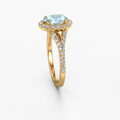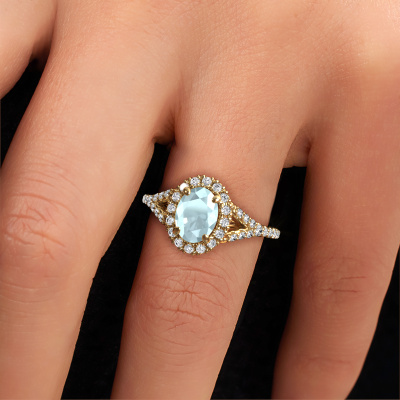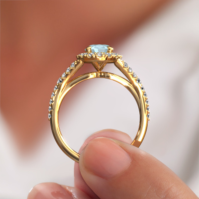 The ring shown above is called the Kimber OVL. We call this type of ring a pavé solitaire ring because it has one center gemstone and a band that is also pave set with gemstones. The 14 Carat gold engagement ring is set with a oval 8x6 mm aquamarine center stone and the band is pave set with lab-grown diamond gemstones. Each jewel is made with passion and love by one of our master goldsmiths.This exclusive gold pavé solitaire engagement ring has an exquisite oval aquamarine center stone. To further accentuate the center stone, the band is fully set with more lab grown diamonds. Its open prong setting allows light to strike the aquamarine from various angles and this adds sparkle to your aquamarine ring. The photo shown above depicts the goldsmith's carefully handcrafted details of the ring. The high positioning of the center stone is truly eye-catching. The perfect engagement ring for the crown jewel of your life! By using a combination of the latest modern techniques, combined with ancient crafting, we can make all our engagement rings in our own studio. Each jewel is made to order. This is advantageous because we can offer you a price you won't find anywhere else.Our team adds new designs to our online collection daily. Our designers and goldsmiths work together in creating the best design. We strive to offer a diverse collection of jewels. Perhaps you have a specific jewel design in mind. One you came across somewhere. Please contact us for a free consultation. We will make you an offer, based on a fair price/ quality ratio, that will baffle you.To make it easier for you, we offer a 30 day return policy. Check our terms and conditions.