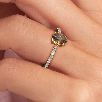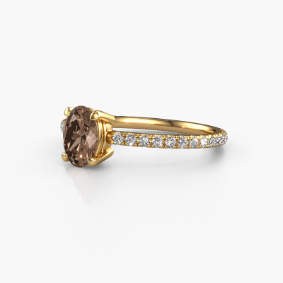 The ring shown above is called the Lynelle 2. We call this type of ring a pavé solitaire ring because it has one center gemstone and a band that is also pave set with gemstones. This engagement ring is made in 14 Carat gold set with a 0.70 crt oval brown diamond, and pave set diamonds at the sides. Each piece of jewelry is created to add sparkle to your finger, each jewel is lovingly made by hand by our goldsmiths.This classic gold pavé solitaire engagement ring has an exquisite oval brown diamond center stone. To further accentuate the center stone, the band is set full with more diamonds. Its open prong setting allows light to strike the brown diamond from various angles and this adds sparkle to your brown diamond ring. The photo shown above depicts the goldsmith's carefully handcrafted details of the ring. The high positioning of the center stone is truly eye-catching. The perfect engagement ring for the crown jewel of your life!After receiving your order, our goldsmiths will start the creative process of making your Lynelle 2 engagement ring. We don't keep stock. This is advantageous because these costs will not be passed on to you. Therefore, we can offer jewelry at exceptionally low prices.Do you have a specific ring in mind? One you came across somewhere. Please feel free to tell us your wishes and we will turn your design into a unique engagement ring. You can follow the development of your ring design because we use 3D drawings. This gives you a realistic preview of your design. We will gladly send you a non-binding offer, based on a fair price/ quality ratio. It will amaze you.To make it easier for you, we offer a 30 day return policy. Check our terms and conditions.