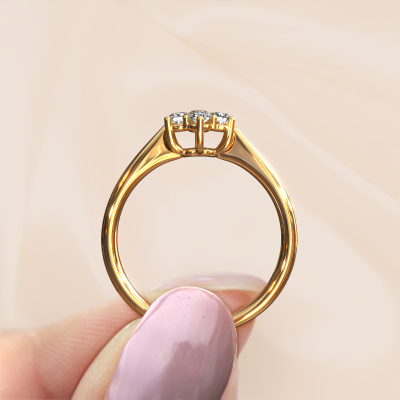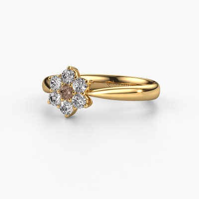 The ring shown above is called the Chantal 1. We call this type of ring a cluster ring. The center gemstone is surrounded by smaller sized stones. This 14 Carat gold version is set with a 0.055 crt round brown diamond center stone, embraced by smaller diamonds. What makes this traditional gold cluster ring special is the setting of the smaller gems surrounding the center brown diamond, which are shaped like a beautiful flower. The surrounding cluster of stones frame the middle center stone in such a way to make it appear bigger. This type of promise ring is also called a flower ring. It is very important that the smaller diamonds are positioned identically so there is no interference of light but perfect unity instead. Our skilled Goldsmiths get the job done. Each individual stone is carefully set by hand. During manufacturing, light fall is constantly monitored to make sure the special cluster effect is still visible. In the end you get the perfect promise ring with a radiant brown diamond gemstone centerpiece. You can imagine the effect of a ring of such significance when you give tot the love of your life on her special day to shine. This jewel is unique in every way! Simply customize to your liking,By using our modern techniques, we can design and customize the finest quality jewels with the utmost care for you. Our promise ring are always priced 30 percent lower than other jewelers. We make promise ring to order so we don't have to maintain a large stock. If you have a certain budget, we are more than happy to advice you accordingly.Our designers and goldsmiths work together each day, creating new jewels. Perhaps you have found a nice traditional promise ring somewhere, which can be used to customize your unique ring. Please feel free to contact us. We will make you an offer, based on a fair price/ quality ratio, which will amaze you.To make it easier for you, we offer a 30 day return policy. Check our terms and conditions.