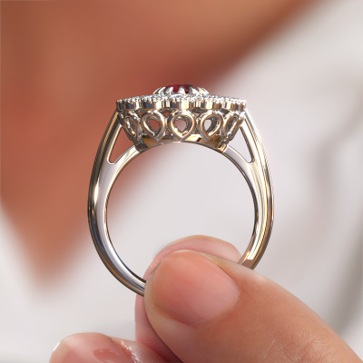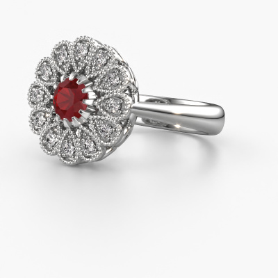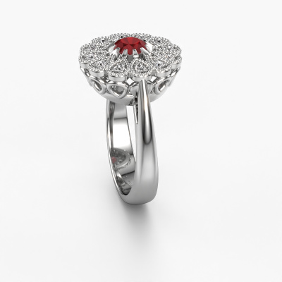 This platinum ring is called Kaat and is set with 5 mm ruby. Is your girlfriend hooked on vintage? Then this platinum pearl edges engagement ring will surely match her style perfectly. A trendy ring with just a hint of vintage adornment. A truly stunning, romantic design! Especially when you customize your ring to your own liking. This vintage cluster engagement ring is set with stunning ruby. As you can see, you are the boss in selecting a gemstone which matches the style of your girlfriend best. Each gemstone is carefully selected by our merchants whom are spread throughout the world. Nothing but the best gems for our expert goldsmith. After all, it is his crowning glory! Each jewel is created to add sparkle to your finger, each jewel is lovingly made by hand by our goldsmiths.Because we design and deliver our own rings, we can offer you a engagement ring at a price you won't find anywhere else. A ring is made to order, which helps prevent excess supplies, so we can make you a great price offer. We understand it feels risky, buying your engagement ring online, but we will gladly assist in the designing process, taking your budget into consideration.Our team adds new designs to our online collection daily. Our designers and goldsmiths work together in creating the best design. We strive to offer a diverse collection of jewels. Perhaps you have a specific jewel design in mind. One you came across somewhere. Please contact us for a free consultation. We will make you an offer, based on a fair price/ quality ratio, that will baffle you.To make it easier for you, we offer a 30 day return policy. Check our terms and conditions.