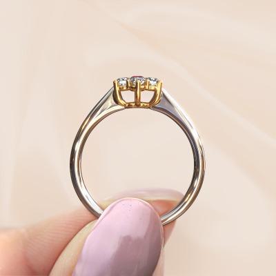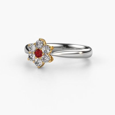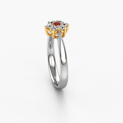 The ring shown above is called the Chantal 1. We call this type of ring a cluster ring. The center gemstone is surrounded by smaller sized stones. This 14 Carat white gold version is set with a 2.4 mm round ruby center stone, embraced by smaller diamonds. What makes this traditional white gold cluster ring special is the setting of the smaller gems surrounding the center ruby, which are shaped like a beautiful flower. The surrounding cluster of stones frame the middle center stone in such a way to make it appear bigger. This type of promise ring is also called a flower ring. It is very important that the smaller diamonds are positioned identically so there is no interference of light but perfect unity instead. Our skilled Goldsmiths get the job done. Each individual stone is carefully set by hand. During manufacturing, light fall is constantly monitored to make sure the special cluster effect is still visible. In the end you get the perfect promise ring with a radiant ruby gemstone centerpiece. You can imagine the effect of a ring of such significance when you give tot the love of your life on her special day to shine. This jewel is unique in every way! Simply customize to your liking,By using our modern techniques, we can design and customize the finest quality jewels with the utmost care for you. Our promise ring are always priced 30 percent lower than other jewelers. We make promise ring to order so we don't have to maintain a large stock. If you have a certain budget, we are more than happy to advice you accordingly.Our designers and goldsmiths work together each day, creating new jewels. Perhaps you have found a nice traditional promise ring somewhere, which can be used to customize your unique ring. Please feel free to contact us. We will make you an offer, based on a fair price/ quality ratio, which will amaze you.To make it easier for you, we offer a 30 day return policy. Check our terms and conditions.