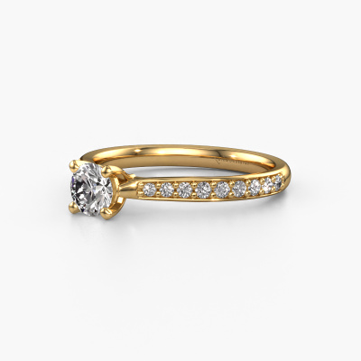 The ring shown above is called the Mignon rnd 2. We call this type of ring a pavé solitaire ring because it has one center gemstone and a band that is also pave set with gemstones. The 14 Carat gold engagement ring is set with a round 0.40 crt diamond center stone and the band is pave set with lab-grown diamond gemstones. Each jewel is made by a team of passionate goldsmiths and jewel designers. This will make your crown jewel truly eye-catching.This luxury gold pavé solitaire engagement ring has an exquisite round diamond center stone. To further accentuate the center stone, the band is fully set with more lab grown diamonds. Its open prong setting allows light to strike the diamond from various angles and this adds sparkle to your diamond ring. The photo shown above depicts the goldsmith's carefully handcrafted details of the ring. The high positioning of the center stone is truly eye-catching. The perfect engagement ring for the crown jewel of your life! By using our modern techniques, we can design and customize the finest quality jewels with the utmost care for you. Our engagement rings are always priced 30 percent lower than other jewelers. We make engagement rings to order so we don't have to maintain a large stock. If you have a certain budget, we are more than happy to advice you accordingly.Different styles of new rings are made daily by our team. Perhaps you have found a pavé solitaire engagement ring somewhere. One you would like to give to your loved one. Please feel free to share your thoughts and design with our jewel designers. We would love to turn your design into a luxury engagement ring. You can follow the development of your ring design because we use very detailed 3D drawings. On top of that, you can order a dummy of the design. A dummy is a plastic ring, which can be shaped according your ring design. You can try it on and check if the engagement ring is up to standard. We will gladly send you a non-binding offer, based on a fair price/ quality ratio. The offer will baffle you, considering the quality of the ring and gemstones.To make it easier for you, we offer a 30 day return policy. Check our terms and conditions.