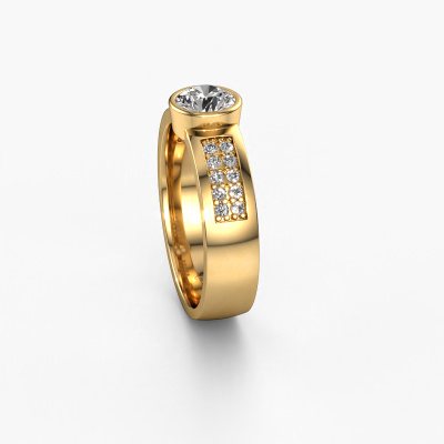 The ring shown above is called the Ise 3. We call this type of ring a pavé solitaire ring because it has one center gemstone and a band that is also pave set with gemstones. The 14 Carat gold engagement ring is set with a round 0.60 crt diamond center stone and the band is pave set with diamond gemstones. Each jewel is made just for you by our master goldsmiths in our own studio.This modern gold pavé solitaire engagement ring has an exquisite round diamond center stone. To further accentuate the center stone, the band is fully set with more diamonds. Its open prong setting allows light to strike the diamond from various angles and this adds sparkle to your diamond ring. The photo shown above depicts the goldsmith's carefully handcrafted details of the ring. The high positioning of the center stone is truly eye-catching. The perfect engagement ring for the crown jewel of your life! Because we design and deliver our own rings, we can offer you a engagement ring at a price you won't find anywhere else. A ring is made to order, which helps prevent excess supplies, so we can make you a great price offer. We understand it feels risky, buying your engagement ring online, but we will gladly assist in the designing process, taking your budget into consideration.Our team adds new designs to our online collection daily. Our designers and goldsmiths work together in creating the best design. We strive to offer a diverse collection of jewels. Perhaps you have a specific jewel design in mind. One you came across somewhere. Please contact us for a free consultation. We will make you an offer, based on a fair price/ quality ratio, that will baffle you.To make it easier for you, we offer a 30 day return policy. Check our terms and conditions.