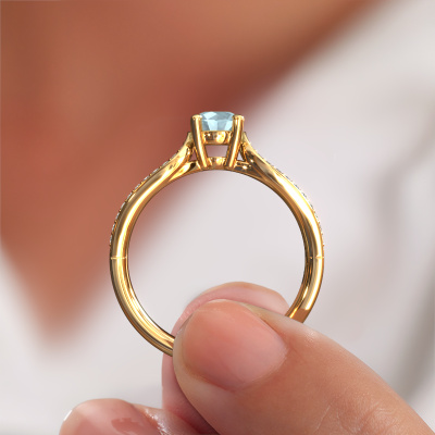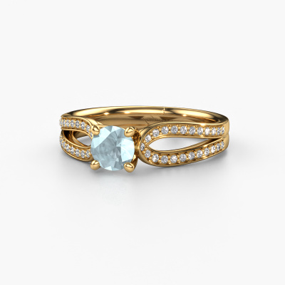 The ring shown above is called the Antonia rnd 2. We call this type of ring a pavé solitaire ring because it has one center gemstone and a band that is also pave set with gemstones. The 14 Carat gold engagement ring is set with a round 5 mm aquamarine center stone and the band is pave set with diamond gemstones. Each jewel is made just for you, with attention to detail and design.This traditional gold pavé solitaire engagement ring has an exquisite round aquamarine center stone. To further accentuate the center stone, the band is fully set with more diamonds. Its open prong setting allows light to strike the aquamarine from various angles and this adds sparkle to your aquamarine ring. The photo shown above depicts the goldsmith's carefully handcrafted details of the ring. The high positioning of the center stone is truly eye-catching. The perfect engagement ring for the crown jewel of your life! After receiving your order, our goldsmiths will start the creative process of making your Antonia rnd 2 engagement ring. We don't keep stock. This is advantageous because these costs will not be passed on to you. Therefore, we can offer jewelry at exceptionally low prices.Have you found a specific engagement ring somewhere which you would like to give to your loved one? Please feel free to express your wishes to our jewel designers because we would be honored to turn your design into a traditional engagement ring. You can follow the development of your ring design because we use 3D drawings. This gives you a realistic preview of how your design will look. You can also preorder a dummy. A dummy is a plastic ring, which can be shaped according your ring design. You can try it on and check if its width and size are suitable for you. We will gladly send you a non-binding offer, based on a fair price/ quality ratio. It will amaze you, considering the quality of the ring and gemstones.To make it easier for you, we offer a 30 day return policy. Check our terms and conditions.