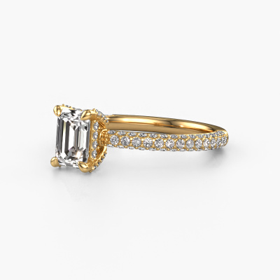 The ring shown above is called the Saskia eme 2. We call this type of ring a pavé solitaire ring because it has one center gemstone and a band that is also pave set with gemstones. The 14 Carat gold engagement ring is set with a emerald cut 0.90 crt diamond center stone and the band is pave set with diamond gemstones. Each jewel is made by a team of passionate goldsmiths and jewel designers. This will make your crown jewel truly eye-catching.This exclusive gold pavé solitaire engagement ring has an exquisite emerald cut diamond center stone. To further accentuate the center stone, the band is fully set with more diamonds. Its open prong setting allows light to strike the diamond from various angles and this adds sparkle to your diamond ring. The photo shown above depicts the goldsmith's carefully handcrafted details of the ring. The high positioning of the center stone is truly eye-catching. The perfect engagement ring for the crown jewel of your life! By using our modern techniques, we can design and customize the finest quality jewels with the utmost care for you. Our engagement rings are always priced 30 percent lower than other jewelers. We make engagement rings to order so we don't have to maintain a large stock. If you have a certain budget, we are more than happy to advice you accordingly.Different styles of new rings are made daily by our team. Perhaps you have found a pavé solitaire engagement ring somewhere. One you would like to give to your loved one. Please feel free to share your thoughts and design with our jewel designers. We would love to turn your design into a exclusive engagement ring. You can follow the development of your ring design because we use very detailed 3D drawings. On top of that, you can order a dummy of the design. A dummy is a plastic ring, which can be shaped according your ring design. You can try it on and check if the engagement ring is up to standard. We will gladly send you a non-binding offer, based on a fair price/ quality ratio. The offer will baffle you, considering the quality of the ring and gemstones.To make it easier for you, we offer a 30 day return policy. Check our terms and conditions.