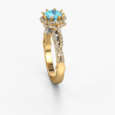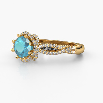 This 14 Carat gold ring is called Lysanne and is set with 6.5 mm blue topaz. This filigree gold engagement ring is a true work of art! A beautifully adorned design of intricate wires. With dedication, patience and the utmost precision, our expert goldsmith will design a ring just for you. The adornment of small wiring is crafted to perfection by hand. It's a lengthy process which includes welding, crafting and polishing until our Goldsmiths are completely satisfied with the result: a perfect eye-catching ring that makes her shine with delight. Therefore the vintage filigree engagement ring is an extraordinary gift to bestow upon the love of your life. A handmade one-of-a-kind personalized ring, to be given to that special someone on that special moment when you pop the question. Isn't that wonderful? This piece of jewelry is made by a team of passionate goldsmiths and jewel designers. This will make your crown jewel truly eye-catching.After receiving your order, our goldsmiths will start the creative process of making your Lysanne engagement ring. We don't keep stock. This is advantageous because these costs will not be passed on to you. Therefore, we can offer jewelry at exceptionally low prices.Have you found a specific engagement ring somewhere which you would like to give to your loved one? Please feel free to express your wishes to our jewel designers because we would be honored to turn your design into a vintage engagement ring. You can follow the development of your ring design because we use 3D drawings. This gives you a realistic preview of how your design will look. You can also preorder a dummy. A dummy is a plastic ring, which can be shaped according your ring design. You can try it on and check if its width and size are suitable for you. We will gladly send you a non-binding offer, based on a fair price/ quality ratio. It will amaze you, considering the quality of the ring and gemstones.To make it easier for you, we offer a 30 day return policy. Check our terms and conditions.