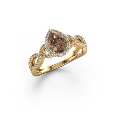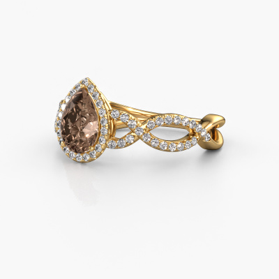 This 14 Carat gold ring is called Dionne pear and is set with 0.99 crt brown diamond. Does your girlfriend fancy exclusive jewelry? Or would you like to show her that she deserves the finest jewelry? This gold ring is pure craftsmanship, love and passion combined with the latest techniques coming together in perfect harmony. It requires a keen eye, patience and a skillful hand to mold this ring into perfection. Just the job for our expert goldsmith! The brown diamonds set gemstones gives this gold ring an extra glamorous appearance. Customize the style of the twist engagement ring to her liking with a wide variety of precious metals and gemstones which you select. That is how you create a unique ring for the most exclusive woman in your life! This jewel is created to add sparkle to your finger, each jewel is lovingly made by hand by our goldsmiths.Are you on a budget? Please feel free to contact us, so we can go discuss your options. We offer our engagement rings at guaranteed best price, because we make them to order. You won't find such a price anywhere else!Different styles of new rings are made daily by our team. Perhaps you have found a pavé solitaire engagement ring somewhere. One you would like to give to your loved one. Please feel free to share your thoughts and design with our jewel designers. We would love to turn your design into a exclusive engagement ring. You can follow the development of your ring design because we use very detailed 3D drawings. On top of that, you can order a dummy of the design. A dummy is a plastic ring, which can be shaped according your ring design. You can try it on and check if the engagement ring is up to standard. We will gladly send you a non-binding offer, based on a fair price/ quality ratio. The offer will baffle you, considering the quality of the ring and gemstones.To make it easier for you, we offer a 30 day return policy. Check our terms and conditions.