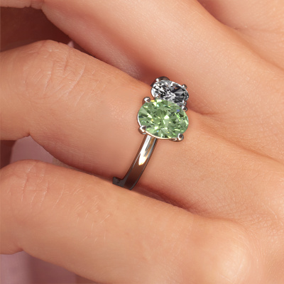This 14 Carat white gold ring is called Toi et Moi OVL-OVL and is set with green lab grown diamond. How would you describe the style of the love of your life? Does she have a unique sense of style? This stunning sublime white gold engagement ring can be custom made to your own or her liking. Our green lab grown diamondd gemstones have been carefully selected because we believe your modern engagement ring must be adorned with nothing but the most beautiful gemstone. Don't you agree? This jewel is made by a team of passionate goldsmiths and jewel designers. This will make your crown jewel truly eye-catching.After receiving your order, our goldsmiths will start the creative process of making your Toi et Moi OVL-OVL engagement ring. We don't keep stock. This is advantageous because these costs will not be passed on to you. Therefore, we can offer jewelry at exceptionally low prices.Different styles of new rings are made daily by our team. Perhaps you have found a 2 stone engagement ring somewhere. One you would like to give to your loved one. Please feel free to share your thoughts and design with our jewel designers. We would love to turn your design into a modern engagement ring. You can follow the development of your ring design because we use very detailed 3D drawings. On top of that, you can order a dummy of the design. A dummy is a plastic ring, which can be shaped according your ring design. You can try it on and check if the engagement ring is up to standard. We will gladly send you a non-binding offer, based on a fair price/ quality ratio. The offer will baffle you, considering the quality of the ring and gemstones.To make it easier for you, we offer a 30 day return policy. Check our terms and conditions.