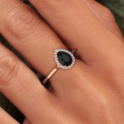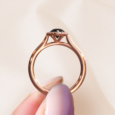 This 14 Carat rose gold ring is called Seline per 1 and is set with 1.10 crt black diamond. This exclusive rose gold halo engagement ring is a true work of art! The ornaments are crafted with a lot of patience and great passion. In order to create this ring with great precision, this craft requires a keen eye and skillful hand. A challenge which ignites a fire in our expert goldsmith. The exquisite black diamonds are set in a special way so they stand out even more. This gives the ring an even more glamorous appearance. The charming engagement ring is actually unique on its own because of the gemstones which we carefully select especially for this ring. On top of that you select the precious metals which will be used to create a unique ring for the most extraordinary woman in your life! This jewel is made with passion and love by one of our master goldsmiths.After receiving your order, our goldsmiths will start the creative process of making your Seline per 1 engagement ring. We don't keep stock. This is advantageous because these costs will not be passed on to you. Therefore, we can offer jewelry at exceptionally low prices.Our team adds new designs to our online collection daily. Our designers and goldsmiths work together in creating the best design. We strive to offer a diverse collection of jewels. Perhaps you have a specific jewel design in mind. One you came across somewhere. Please contact us for a free consultation. We will make you an offer, based on a fair price/ quality ratio, that will baffle you.To make it easier for you, we offer a 30 day return policy. Check our terms and conditions.